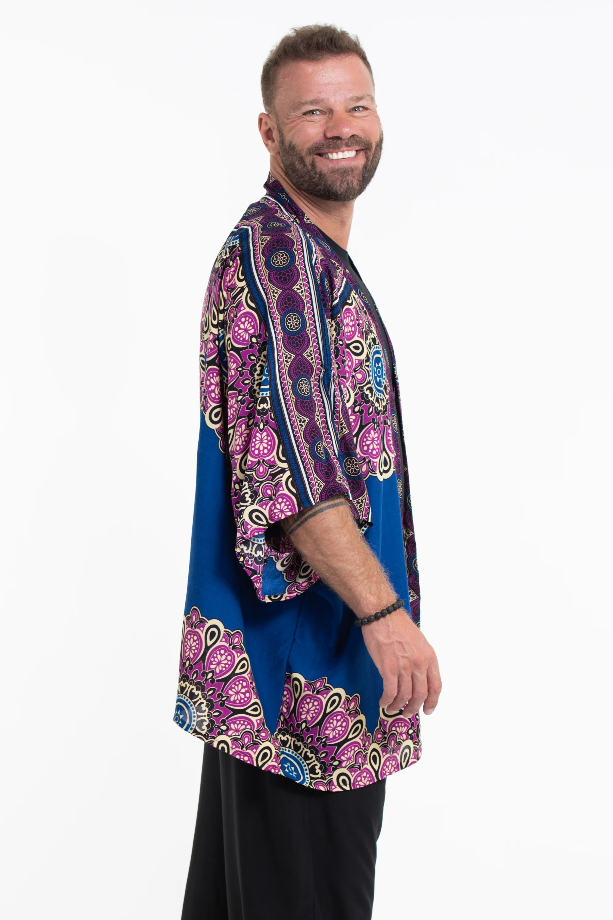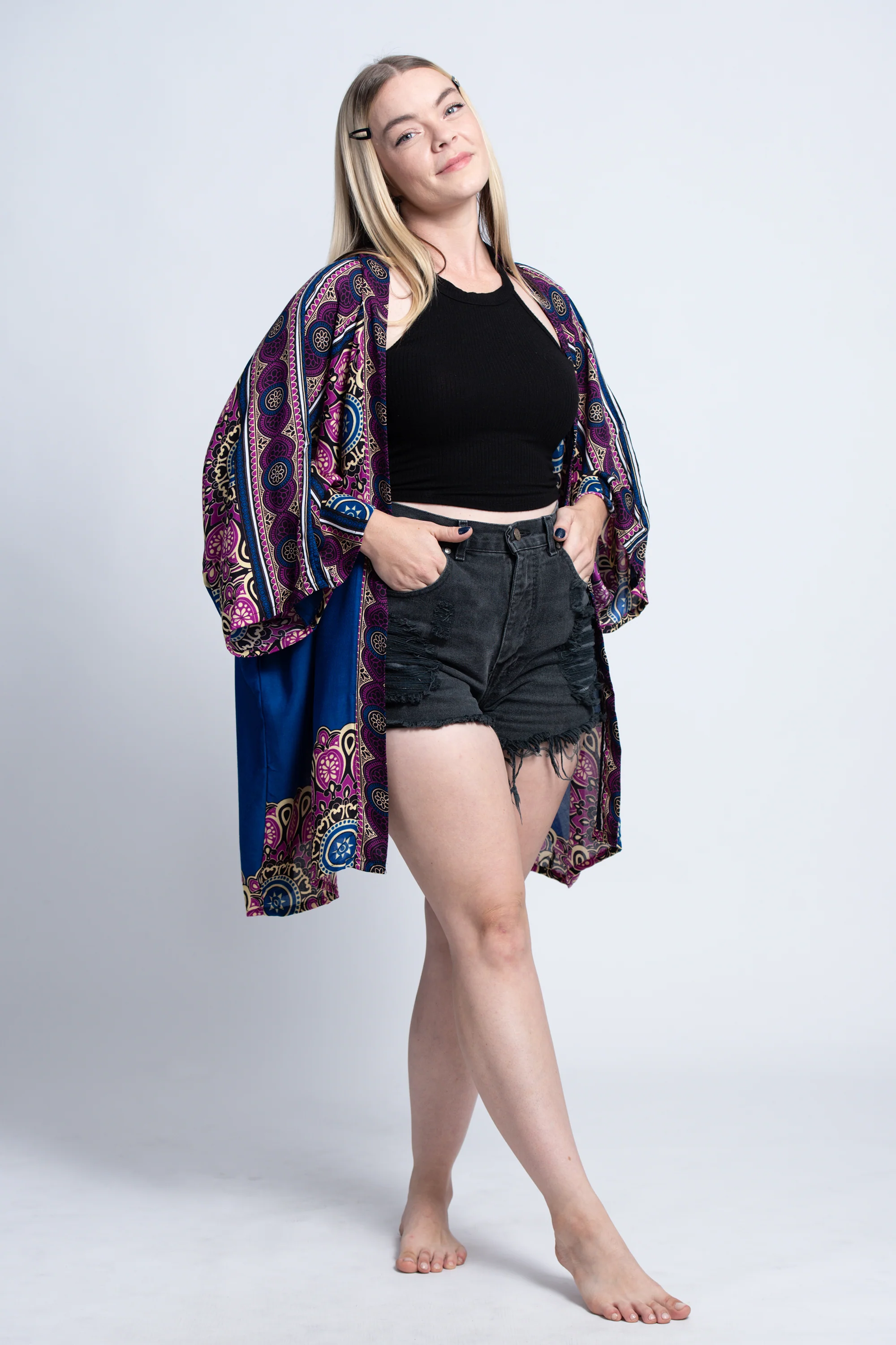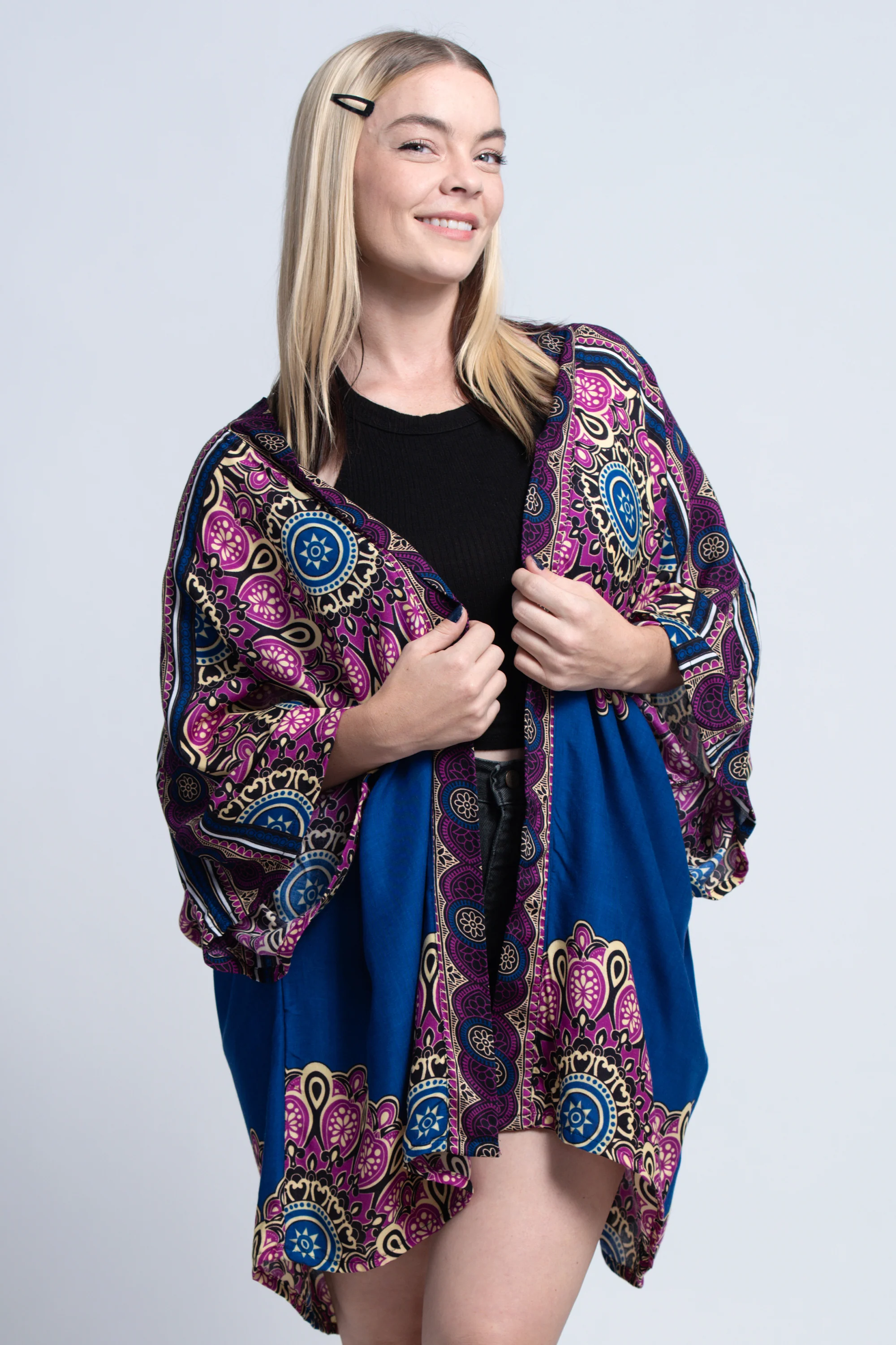 Soft flowy all-around marvelous Kimono Cardigan featuring beautiful electric funky pattern made with Thai rayon fabric.