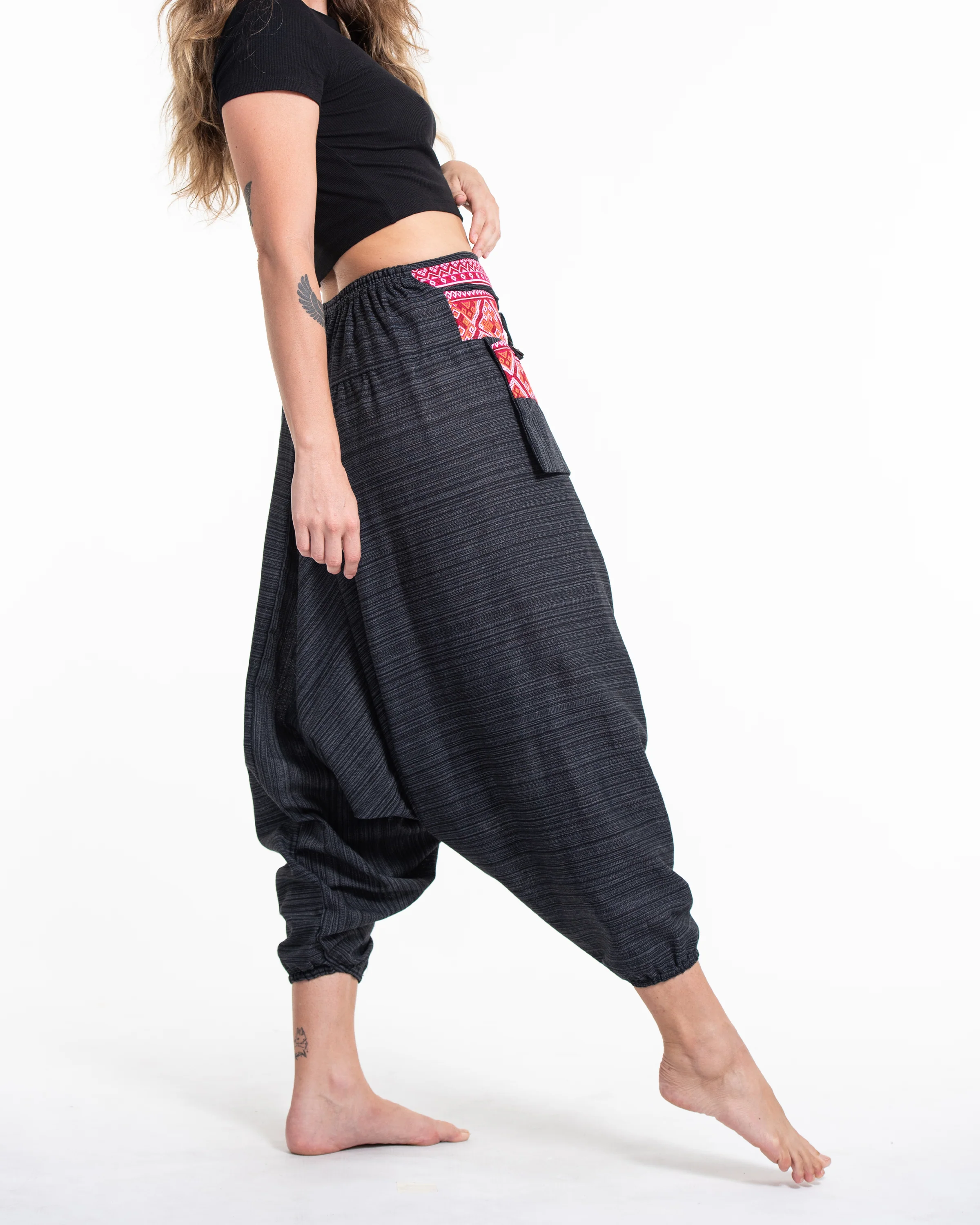 Pinstripe Cotton Low Cut Women’s Harem Pants With Hill Tribe Trim Black
