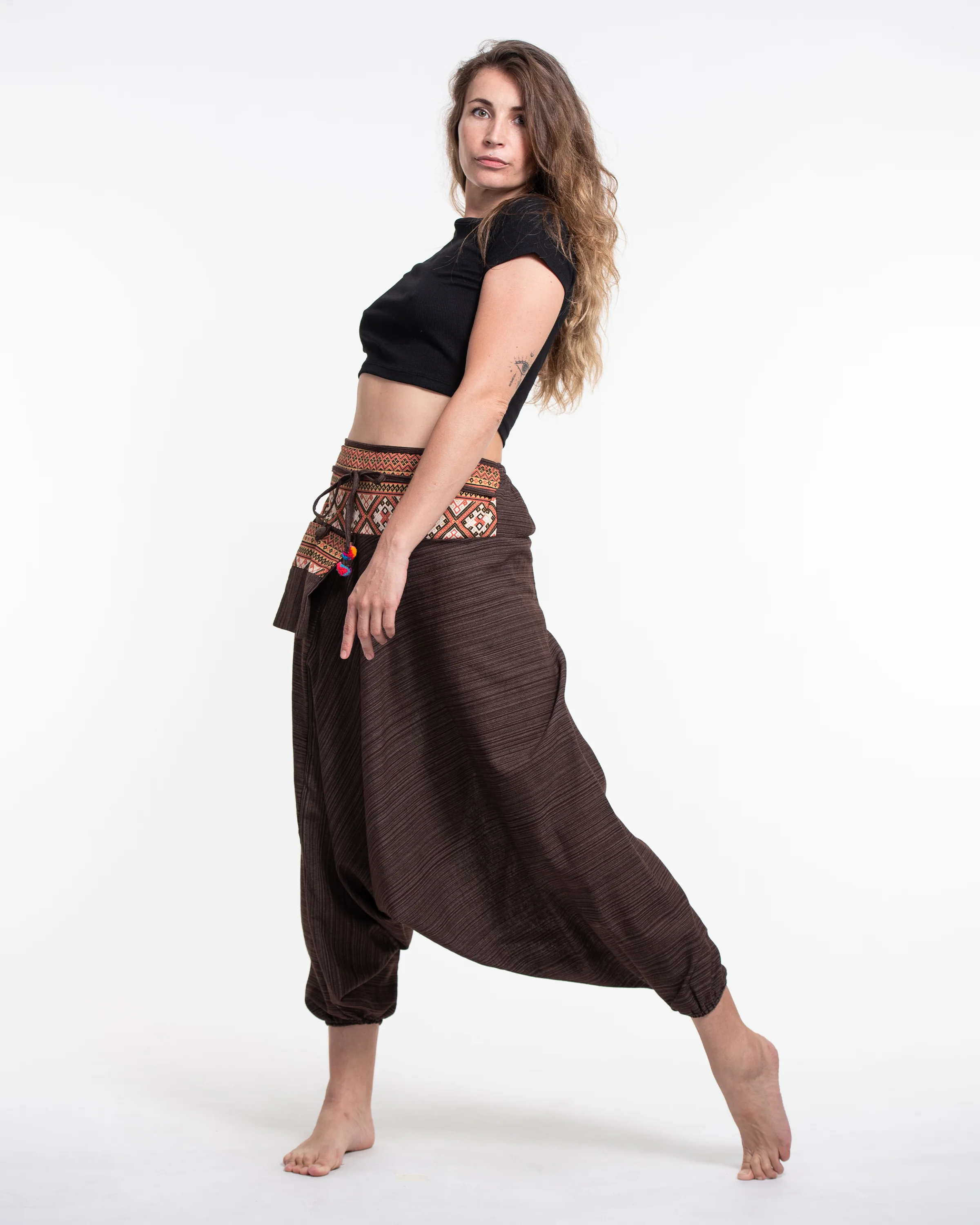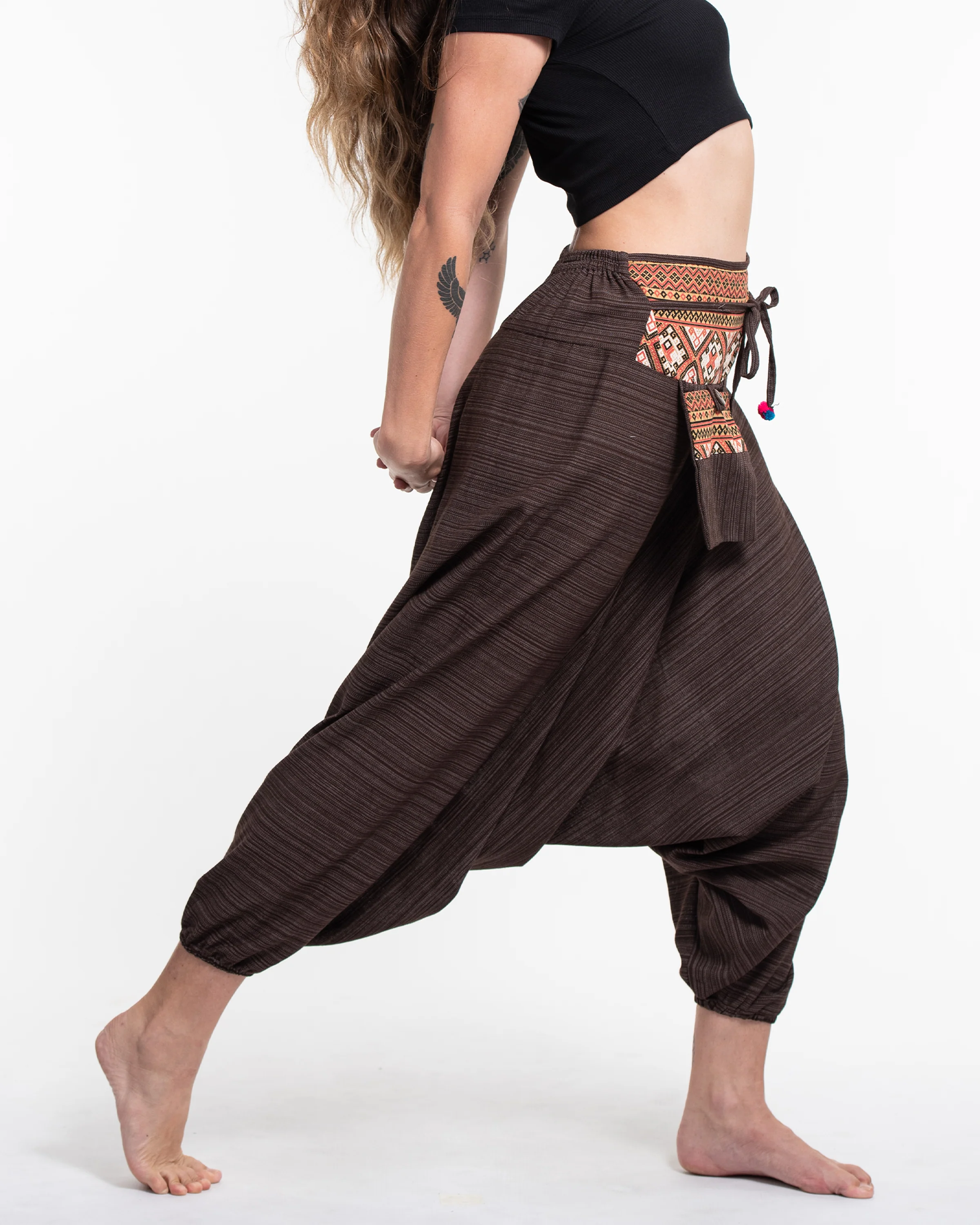 Pinstripe Cotton Low Cut Women’s Harem Pants With Hill Tribe Trim Brown