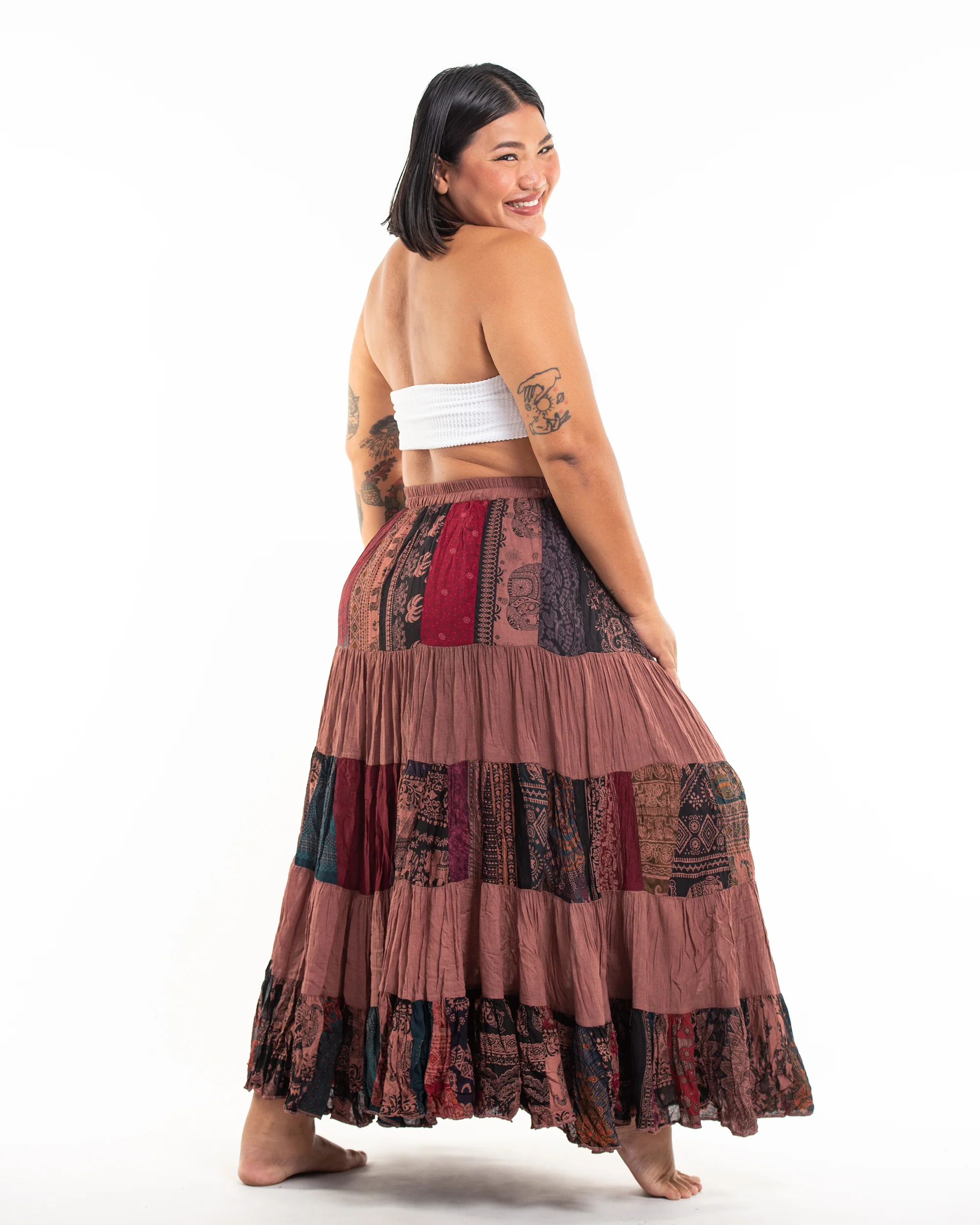 This one-of-a-kind patchwork skirt is sustainably made from upcycled cotton and rayon fabric scraps, featuring a beautiful and eclectic design with various shapes and sizes of fabric pieces sewn together. The lightweight and comfortable materials make it a perfect summer wear option.