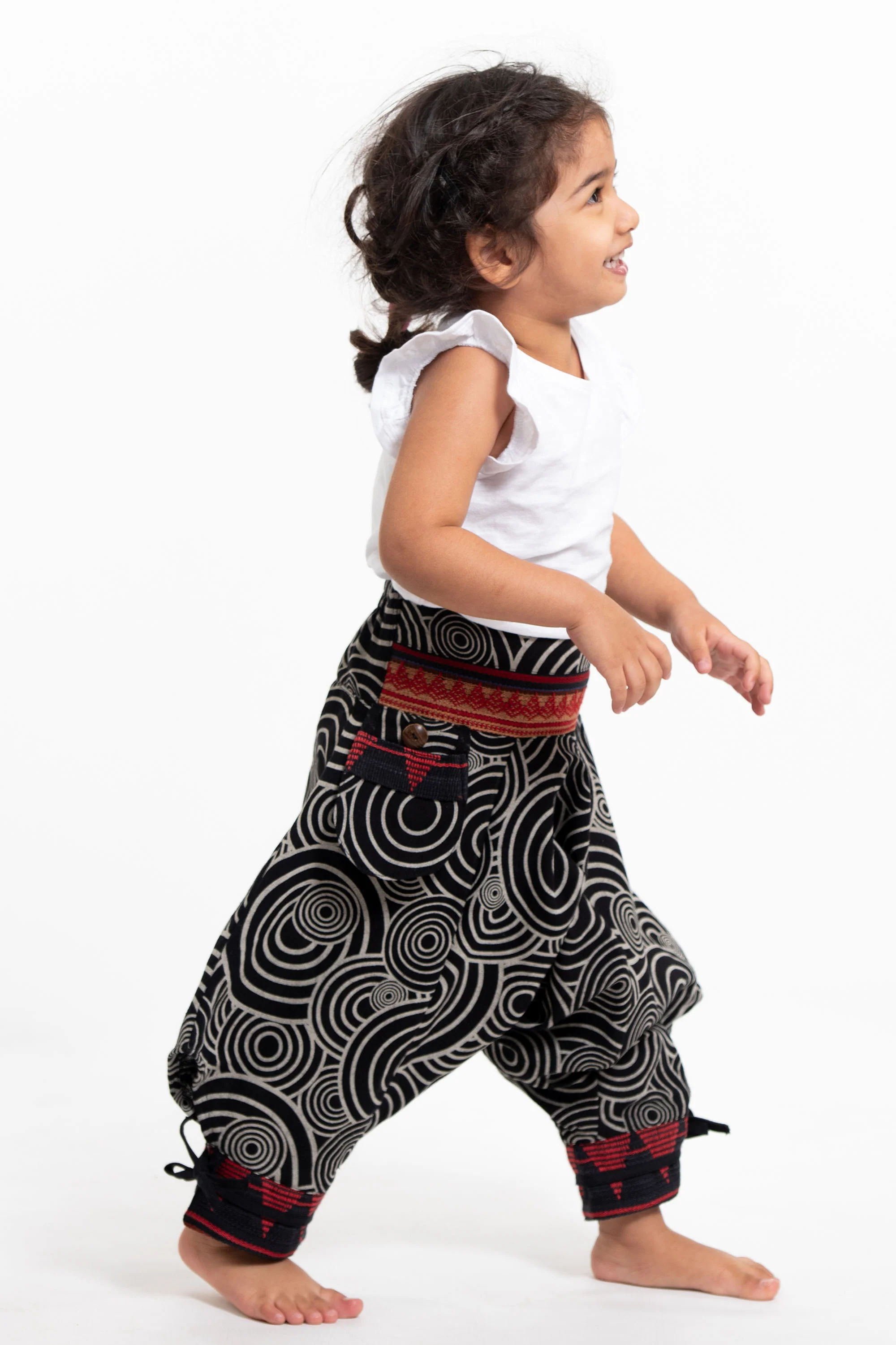 Swirls Prints Thai Hill Tribe Fabric Kids Harem Pants with Ankle Straps in Black