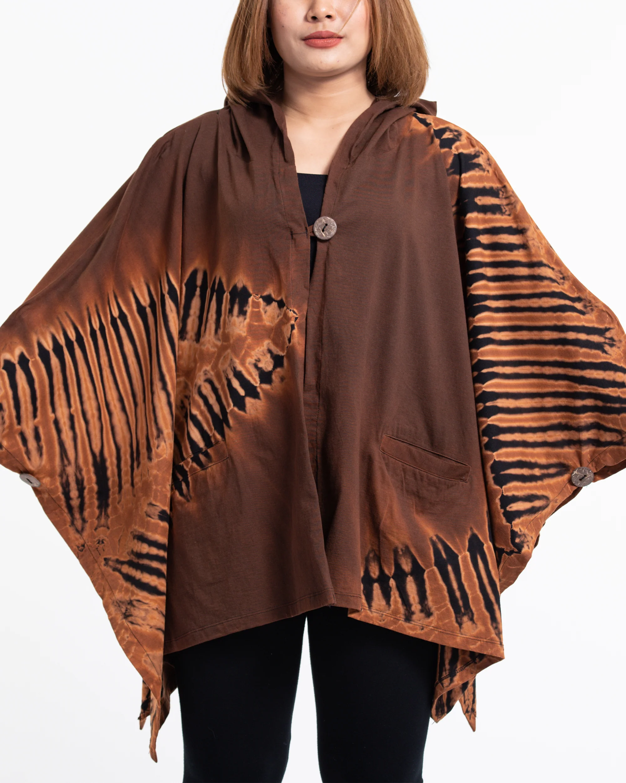 Tie Dye Cotton Hooded Poncho Jacket in Brown 09